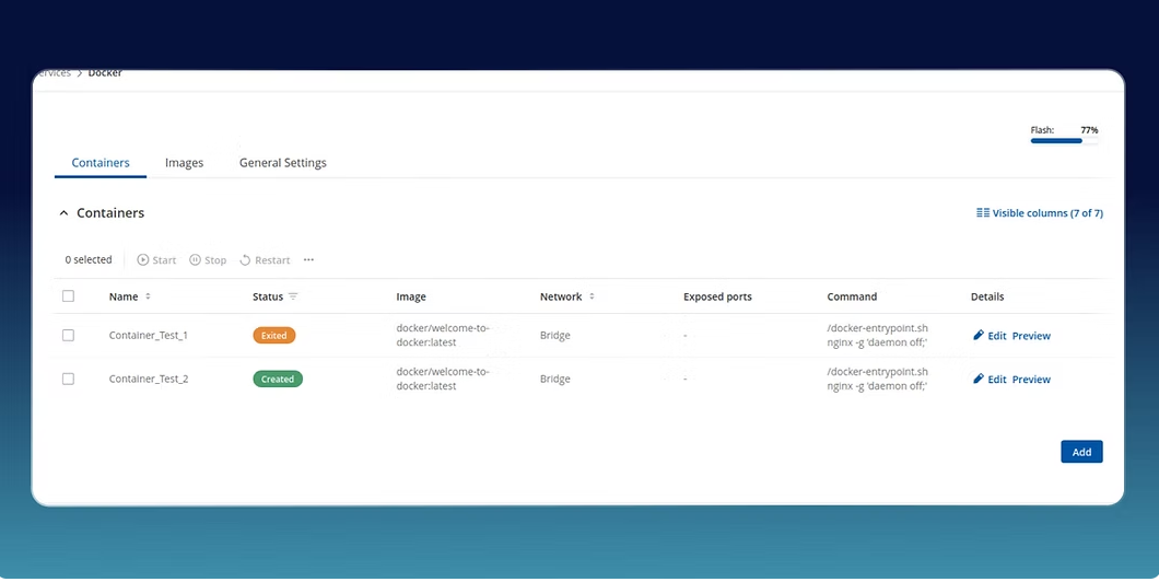 Con RutOS 7.16, la gestión de aplicaciones en contenedores se vuelve mucho más intuitiva en los routers RUTC50 5G, gracias a la página WebUI dedicada de Docker. Esta nueva interfaz permite a los usuarios configurar y controlar los contenedores Docker directamente a través de la interfaz web de los routers 5G, eliminando la necesidad de acceder a la línea de comandos o a herramientas externas.