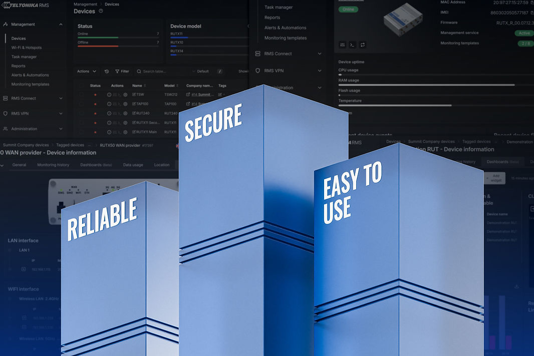 Una de las ventajas más subestimadas de elegir un router industrial es la capacidad de gestión a largo plazo. Con el sistema RMS (Sistema de Gestión Remota) de Teltonika, puede configurar, supervisar, actualizar y solucionar problemas de toda su flota de routers desde cualquier parte del mundo.