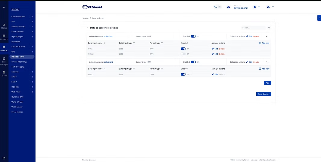 La gestión de la transmisión de datos ahora es más flexible y cómoda con el último firmware de RutOS. Las configuraciones de entrada individuales en las colecciones de Datos al Servidor se pueden habilitar o deshabilitar mediante controles dedicados, lo que permite pausar flujos de datos específicos sin eliminar su configuración.