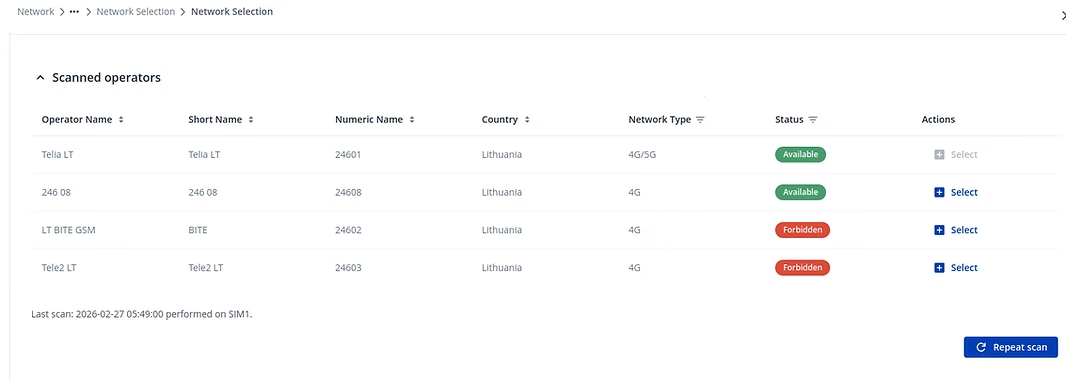 El escaneo de redes móviles ahora muestra el nombre del país junto a cada operador detectado. Este contexto geográfico adicional facilita la distinción entre redes, especialmente en zonas fronterizas o entornos multinacionales, lo que permite una selección de red más rápida y segura.