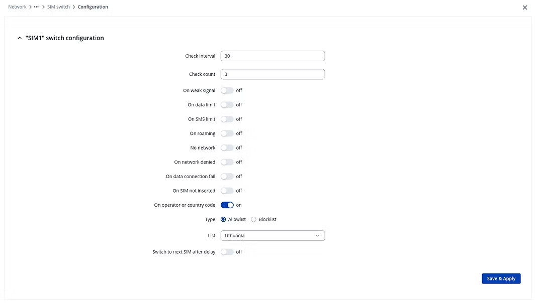 En la última actualización de RutOS, el cambio de SIM se puede configurar según el país de conexión o el operador móvil específico. La configuración permite que el router cambie de tarjeta SIM cuando el módem se conecta a una red definida o cuando se encuentra fuera del país u operador especificado. El control basado en la ubicación y el operador ayuda a evitar el roaming involuntario, a gestionar los costes de conectividad de forma más eficaz y a mantener el uso de las redes preferidas en diferentes regiones.