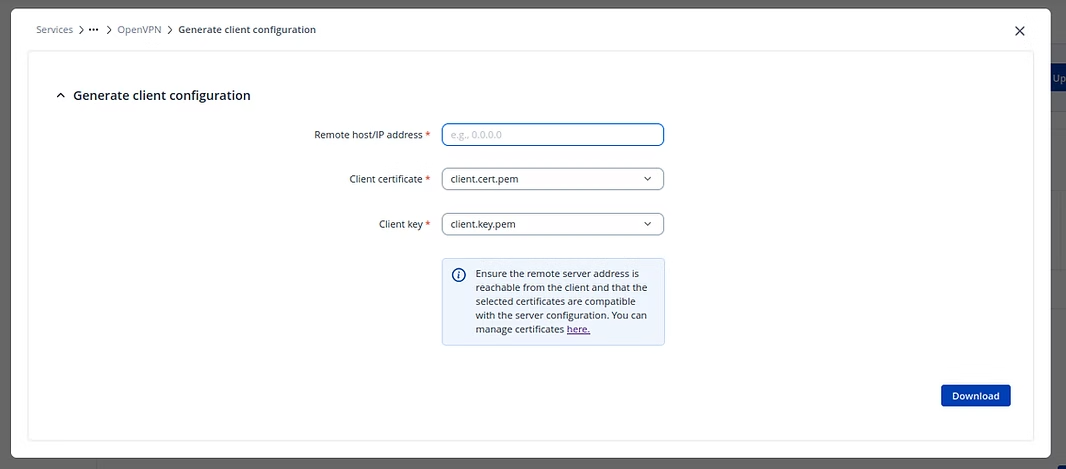 El archivo de configuración generado se puede descargar e importar a cualquier dispositivo que ejecute un cliente OpenVPN, lo que reduce la configuración manual y ayuda a evitar errores de configuración.